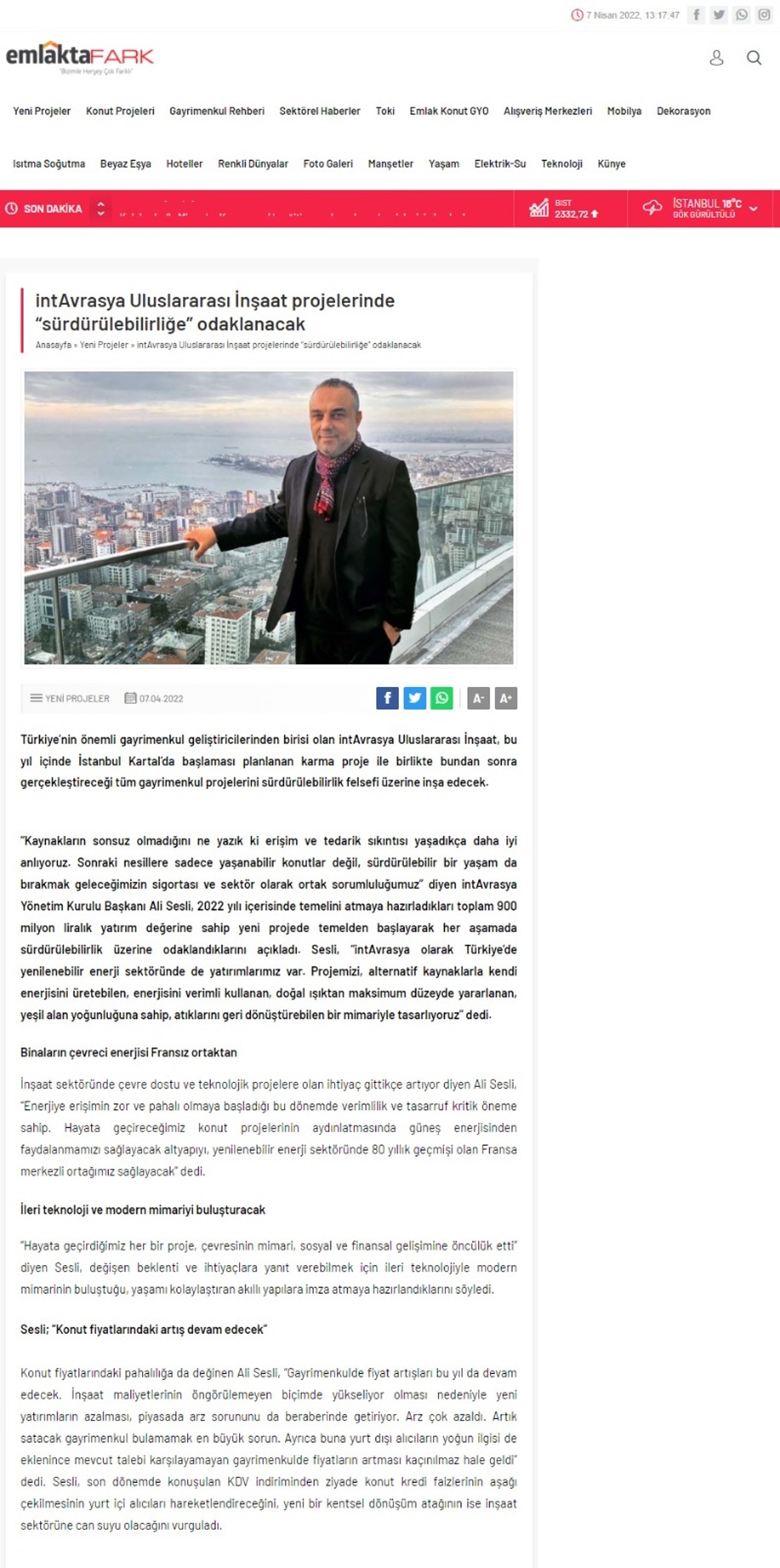 Türkiye'nin önemli gayrimenkul geliştiricilerinden birisi olan intAvrasya Uluslararası İnşaat, bu yıl içinde İstanbul Kartal'da başlaması planlanan karma proje ile birlikte bundan sonra gerçekleştireceği tüm gayrimenkul projelerini sürdürülebilirlik felsefi üzerine inşa edecek.